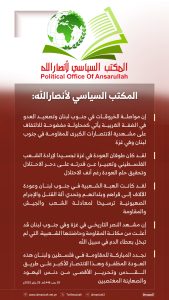 المكتب السياسي لأنصارالله: إن مشهد النصر التاريخي في غزة وفي جنوب لبنان قد أعلت من مكانة المقاومة وحاضنتها الشعبية، التي لم تبخل بعطاء الدم في سبيل الله