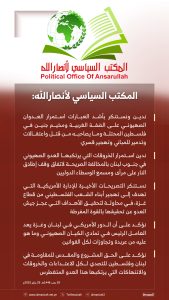المكتب السياسي لأنصارالله: نؤكد على الحق المشروع والمقدس للمقاومة في لبنان وفلسطين للتصدي لكل الاعتداءات والخروقات والانتهاكات التي يرتكبها هذا العدو المتغطرس