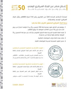 #إعلان_صادر عن #البنك_المركزي_اليمني بشأن وضع نقود معدنية فئة (50) خمسين ريالًا للتداول
