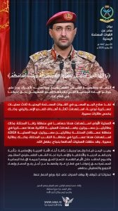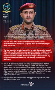 بيان القوات المسلحة اليمنية بشأن تنفيذ ثلاث عمليات عسكرية استهدفت ثلاثة أهداف للعدو الإسرائيلي في يافا وعسقلان والنقب بفلسطين المحتلة وذلك بخمس طائرات مسيرة.